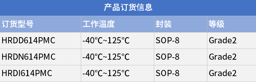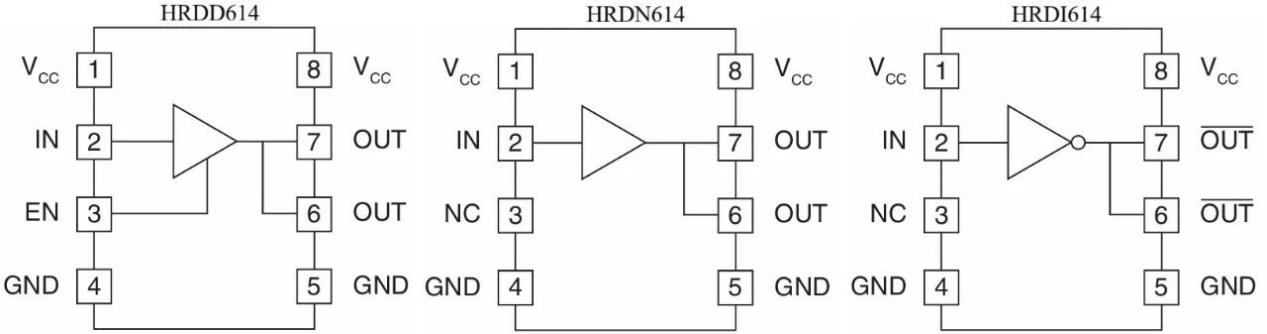 RDD614 被配置為帶使能的非反相驅(qū)動(dòng)器。HRDN614 被配置為非反相驅(qū)動(dòng)器,而HRDI614 被配置為反相驅(qū)動(dòng)器。HRD_614 系列用在8 引腳塑封表貼SOP 封裝中。