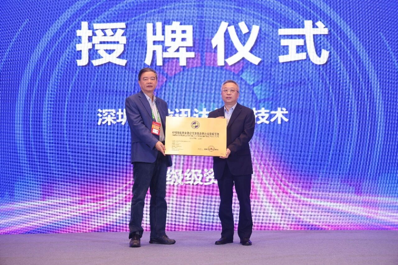 協會副會長、中國計量大學原黨委副書記肖剛教授為深圳華龍迅達信息技術股份有限公司頒發“中國機電職業教育實訓裝備供應商三級資質”匾牌。