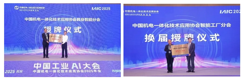 開幕式現場,協會副會長兼秘書長程光為具身智能分會授牌,該分會聚焦了智能機器人技術架構搭建、標準制定及人才培育,破解具身智能發展瓶頸,為汽車、電子、新能源等領域提供更適配的具身智能解決方案。副會長孫立寧為換屆改選后的智能工廠分會授牌,助力深化智能工廠建設的經驗傳承與創新實踐,推動智能工廠在流程工業、高端裝備制造等領域的規模化落地。兩大分會的成立和換屆成功,標志著我國工業AI領域形成“技術攻關+場景落地”的雙輪驅動格局,進一步完善了工業 AI 產業生態體系。