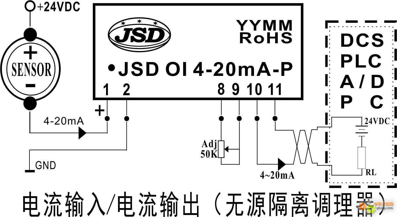 JSD OI 4-20mA-P產品使用非常方便,只需外接一個50KΩ的多圈電位器進行ADJ校正,即可實現兩線制4-20mA信號的隔離放大與變換。