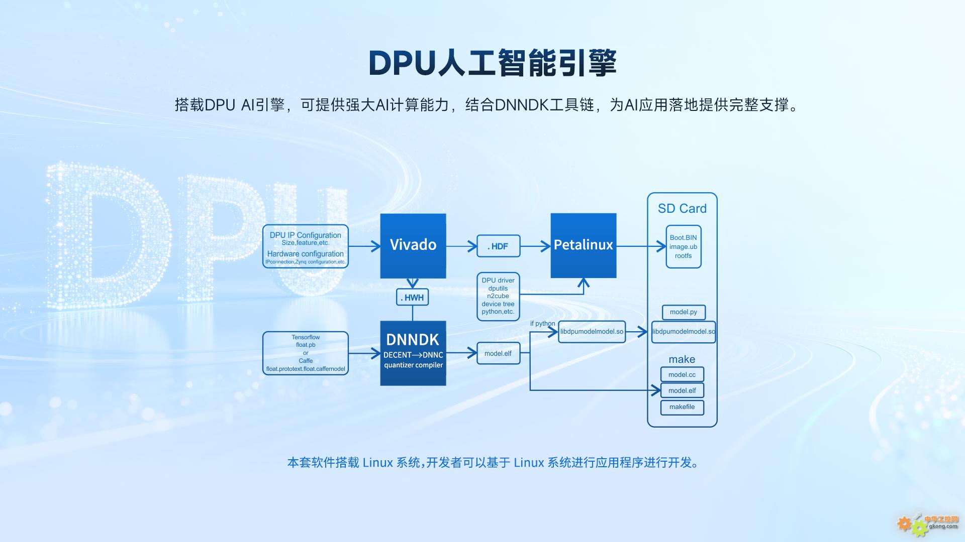 Xilinx®深度學習處理器單元(DPU)是專用于卷積神經的可配置計算引擎網絡。引擎中使用的并行度是設計參數,可以根據需要選擇目標設備和應用程序。 它包含一組高度優化的指令,并支持大多數卷積神經網絡,例如VGG,ResNet,GoogLeNet,YOLO,SSD,MobileNet,FPN等。MYC-CZU3EG-V3搭載DPU AI引擎,可提供強大AI計算能力,結合DNNDK工具鏈,為AI應用落地提供完整支撐。