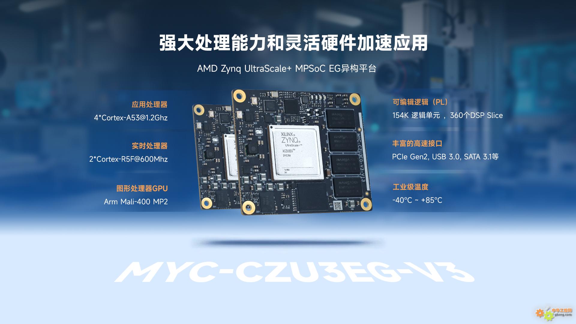 米爾基于AMD Zynq UltraScale+ MPSoC EG核心板,具有PCIe Gen2, USB 3.0, SATA 3.1, 千兆以太網, DisplayPort等高速接口。