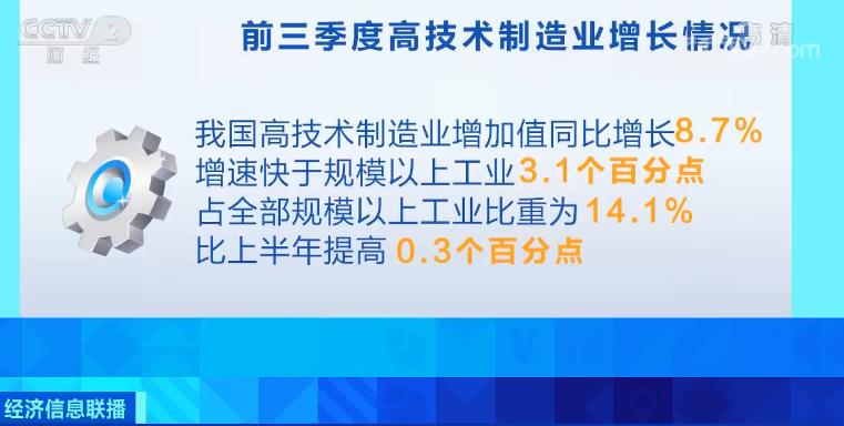 國家統計局數據顯示,今年前三季度,我國高技術制造業增加值同比增長8.7%,增速快于規模以上工業3.1個百分點,占全部規模以上工業比重為14.1%,比上半年提高0.3個百分點。