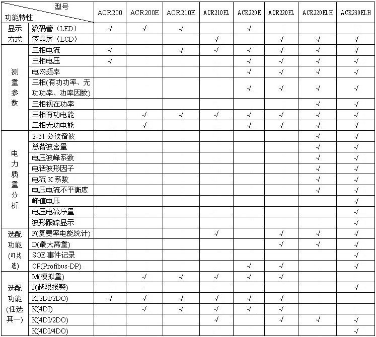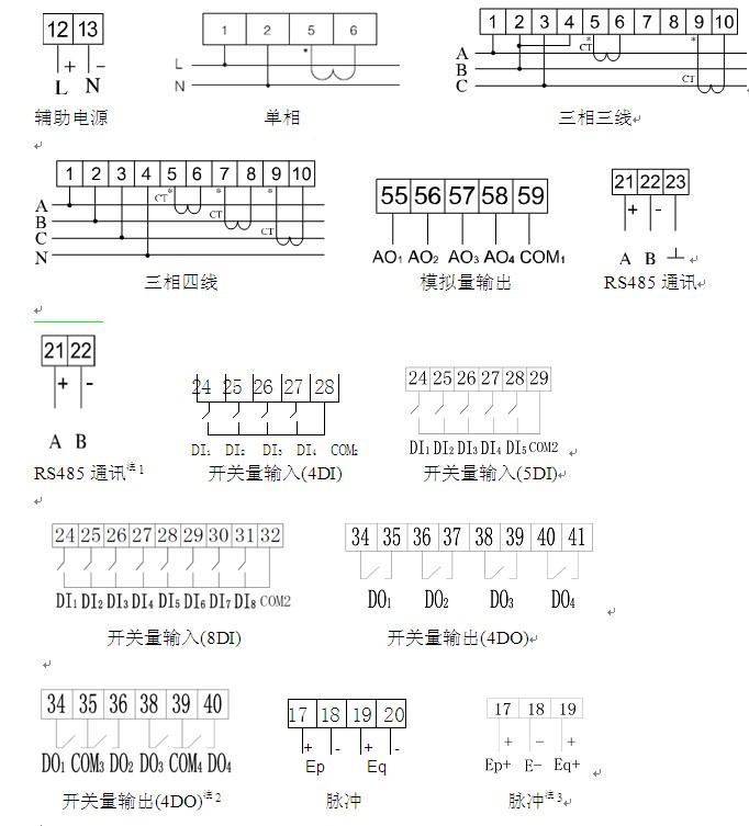 注:1、ACR300E、ACR310E、ACR320E(L)在選配K(4DI/4DO、8DI/4DO)功能時無脈沖信號輸出端口;