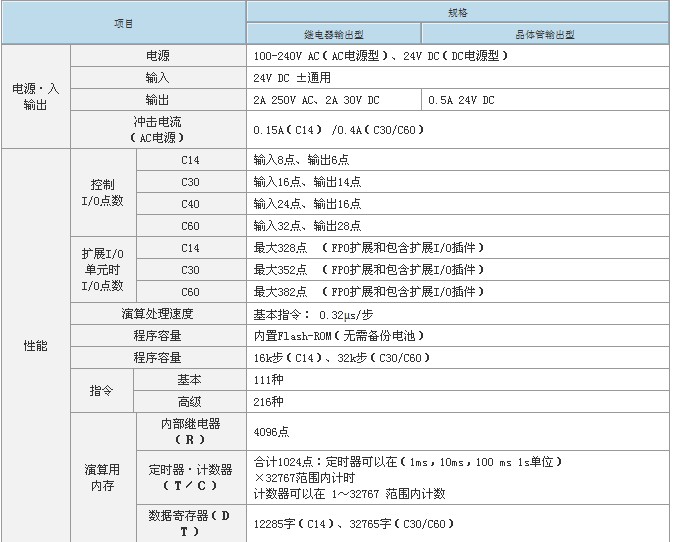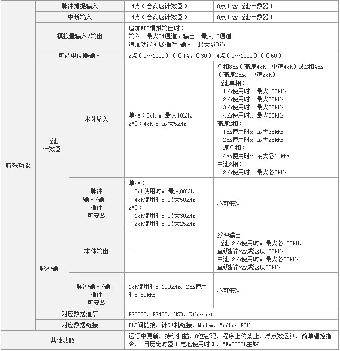 輸入/輸出、脈沖I/O、模擬量I/O、通信(RS485、RS232C、Ethernet)、外部存儲器