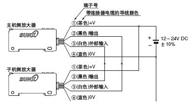 ①將主機側放大器的設定復制模式設為復制發信ON后按MODE按鈕,待數字顯示屏上顯示“ ”后設為復制預備狀態。有關設定方法,請參閱操作指南。 ② 切斷主機側放大器的電源。 ③如下圖所示,對主機側放大器和子機側放大器進行配線。 |