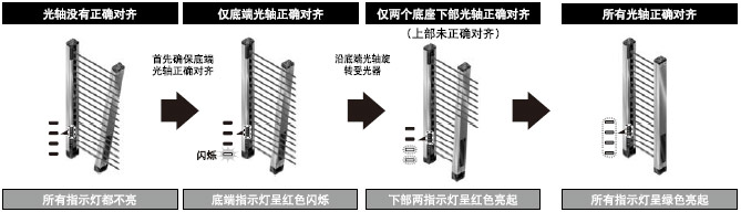 光軸對齊指示燈分布在傳感器的四個部分。當光束對齊時,該部分指示燈亮成紅色,用戶可簡單分辨哪些光軸對齊了。一旦所有對齊完成,所有指示燈都亮成綠色。對齊光軸的最初,當底端和頂端的光軸(標準光軸)對齊后,相應的底端和頂端對齊指示燈呈紅色閃爍。所以,在頂端或底端簡單把光軸對齊后,沿此光軸旋轉光幕傳感器即可。光軸對齊指示燈在投光器及受光器上都有分布,故對齊和未對齊的光軸可一目了然。