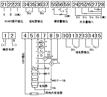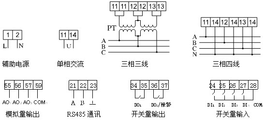 儀表可具有RS-485 通訊接口,采用Modbus-RTU 協議;可帶模擬量輸出、繼電器報警輸出、開關量輸入/輸出。根據不同要求,通過儀表面板按鍵,對變比、報警、通訊、開關量輸出進行設置與控制。