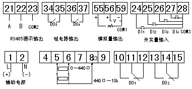 注:J(繼電器越限報警輸出)與第二路開關量輸出復用。