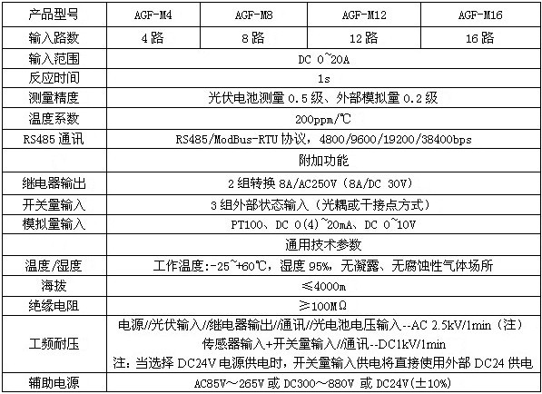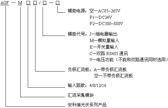 AGF系列光伏匯流采集裝置是專門應(yīng)用于智能光伏匯流箱,用于監(jiān)測光伏電池陣列中電池板運行狀態(tài),光伏電池電流測量,匯流箱中防雷器狀態(tài)采集、直流斷路器狀態(tài)采集、繼電器接點輸出,帶有風(fēng)速、溫度、輻照儀等傳感器接口,裝置帶有RS485接口可以把測量和采集到的數(shù)據(jù)和設(shè)備狀態(tài)上傳。