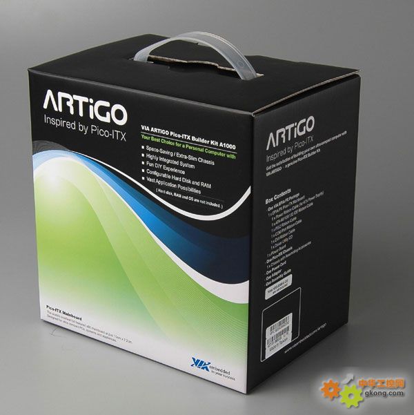 威盛 ARTiGO Pico-ITX A1000 組裝套件包含一塊 1GHz 威盛 EPIA Pico-ITX 主板,精巧的 Pico-ITX 機箱,電源適配器及相關配件。