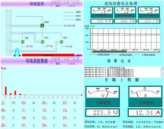 主要檢測數(shù)據(jù)對象有母線電流、電壓、功率、電能、母線諧波數(shù)據(jù),各個支路電壓、電流、功率、電能,及各個支路的分合狀態(tài)。顯示以數(shù)字顯示、折線圖、柱狀圖為主,見圖3。
