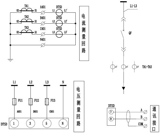 該儀表主要監(jiān)測電流大于63A的回路。儀表不需要工作電源,功耗≤2W;電壓信號輸入,220V/380V 50Hz;電流信號輸入,一次電流不大于63A可直接輸入,63A以上二次輸入0~5A。主要功能有測量常規(guī)的三相交流電量,如相電壓、線電壓、電流、有功功率、無功功率、視在功率、功率因數(shù)等,其中功率與功率因數(shù)可同時檢測分相與三相總的參量;電能有四象限電能,包括吸收有功電能,釋放有功電能,感性無功電能,容性無功電能;該儀表可用于1個三相回路中也可用于3個獨立的單相回路。
