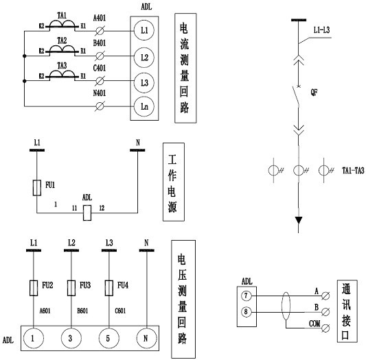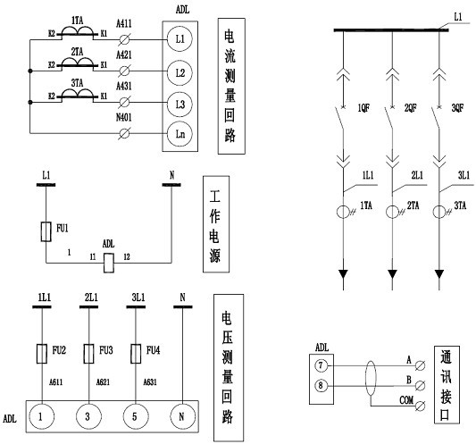 用于三相回路的二次原理見圖7,ADL-300E支持0.05A電流信號接入,電流互感器二次側(cè)不允許接地。
