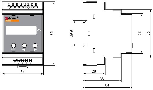 二次原理見圖4,DTSD1352-H在電流不大于63A時可直接接入,不需要經(jīng)過電流互感器,大于63A時采用二次輸入0-5A。安裝結(jié)構(gòu)為DIN35mm導軌,見圖5。