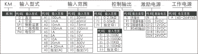 ⊙型號構成,可以看出測量(交直流電流,交直流電壓,倒數運算,二線電阻,電位計信號)