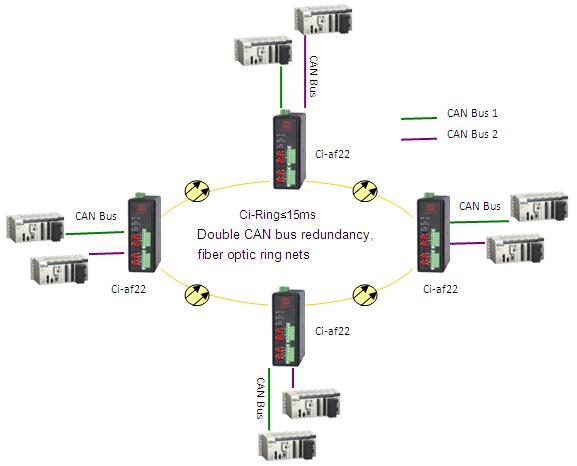 網絡組網拓撲結構可以實現以下網絡連接:點對點通訊、鏈型網絡、星型網絡、冗余雙網及光纖環網自愈保護等.本產品應用靈活,可以組成多種光纖網絡。邏輯獨立雙總線電接口,可實現電接口的備份或者單設備接入雙冗余系統;采用點對點的網絡時可以實現通過光纖連接兩CAN總線的網段;采用雙光口鏈形網絡的光纖總線上實現多網段的CAN總線連接(最多200個);同時,本產品采用雙光口實現雙纖環網冗余功能,當某處光纖故障時,系統會在15ms內重建網絡鏈路,保障系統的正常通信,實現對信號傳輸的自愈保護功能,網絡故障排除后系統會自動恢復;該系列產品采用公司自行研發的專有環網協議Ci-Ring,不需任何設置,不需要根節點,快速完成網絡的成環和解環功能,該系列產品即插即用,不需配置,最大程度的使用戶安裝和調試過程簡單化。