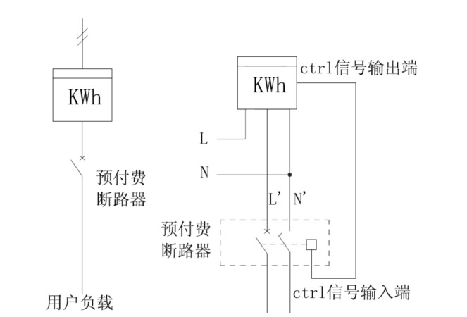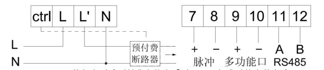 注:①接線時務必擰緊,避免因接觸不良而引起電能表工作不正常;②電能表ctrl端子用于連接預付費表專用斷路器的ctrl信號輸入端,以完成對負載回路的控制?刂剖疽鈭D如下: