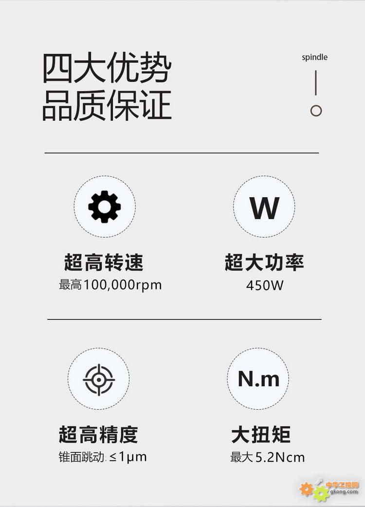 為工業機器人(金屬及復合材料加工),PCB分板(鋁基板、銅基板切割),數控機床改造(提升加工效率),義齒加工(氧化鋯、鈦合金,CAD CAM),廣告行業(非金屬材料、柔性材料加工),陶瓷插芯(內外圓研磨),微孔加工提供高速主軸&機器人成套解決方案。