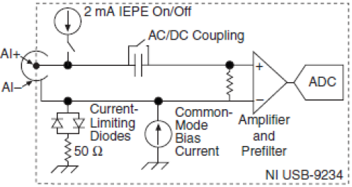 圖14 9234對IEPE傳感器的調(diào)理 此外,NI 445x和446x的DSA采集卡也是專門針對動態(tài)信號設(shè)計的。