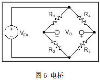 由于應(yīng)變片的阻值變化是微弱的,測量應(yīng)變幾乎都采用帶電壓激勵的電橋形式。惠斯通電橋由4條電阻橋臂及作用于整個電橋的激勵電壓VEX組成(圖6),