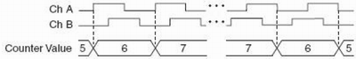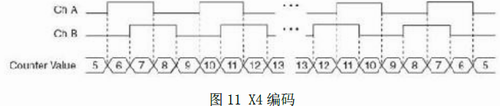 X4編碼方式時,計數(shù)器同樣也在通道A和B的每個沿上發(fā)生增加或者減少。計數(shù)器的數(shù)目是增加還是減少,取決于哪個通道引導(dǎo)哪個通道。計數(shù)器的數(shù)目每個周期都會增加4個或減少4個(圖11):