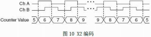 X2編碼方式時,計數(shù)器A通道的每個邊沿計數(shù)是增加還是減少,取決于由哪個通道引導(dǎo)哪個通道。計數(shù)器的數(shù)值每個周期都會增加2個或減少2個(圖10):