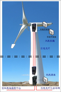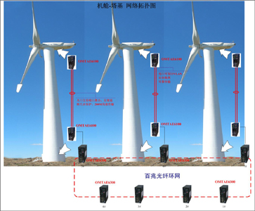 本方案基于歐邁特工業以太網交換機性價比及網絡可靠性的綜合考慮,針對兩個部分的網絡通信(可選多;騿文9饫|)建議如下: 1、風機內部控制通信部分 主要是指風機機艙與塔基之間設備的通信,負責監控以下數據:1、電力參數包括電網三相電壓、發電機輸出的三相電流、電網頻率、發電機功率因數等;2、風力參數:風速、風向;3、風力發電機組狀態參數:發電機轉速和風輪轉速、溫度(發電機、控制器、軸承、增速器油溫等)、電纜扭轉、機械剎車狀況、機艙振動、油位;4、反饋信號:回收葉間擾流器、松開機械剎車、松開偏航制動器、發電機脫網及脫網后轉速降落信號等。