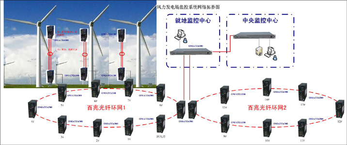 摘要 隨著風力發電場的大量建設,風場變電站SCADA監控系統、風場視頻安防系統、風力發電機組遠程監控系統也大量應用,監控系統的建設對于風機的安全監控、提高風能利用率、提高風機工作效率、風電場的安全監控都十分重要。但這些系統應用環境惡劣,需要管理型寬溫工業以太網交換機進行網絡支持。 關鍵詞 歐邁特工業以太網交換機OMATE6100、OMATE6300;OE-Ring快速環網冗余技術 一. 系統需求 風力發電場對網絡設備的需求: 1、風電應用環境惡劣,晝夜溫差大,風沙嚴重,要求工作溫度:-40~75℃ 存儲溫度:-45~85℃ ,存儲濕度:0%~95%,無凝結。 2、電磁環境惡劣,需要工業交換機具有較強的抗電磁干擾能力、長時間的平均無故障時間。 3、為了保障通信的可靠性,要求建立冗余的環網,具有快速自愈功能。通信網絡出故障時,能夠自動平滑的切換到冗余備份線路。 4、為了保證遠程監控的數據的安全性,交換機需要有全面的網絡安全設置。 二. 網絡設計方案 風電機組監控系統具有對風電機組自動啟動、停機、平穩并網、雙速切換、自動對風、數據檢測和處理、故障記錄及自動保護等就地控制功能,同時具有在中央監控室對分散運行在風電場上的各風電機組運行狀態的實時顯示、運行數據的統計處理、運行故障記錄報警、風速-功率特性曲線的測量、開機、停機、左右偏航、修改風電機組運行參數等遠程監控功能。由三部分組成:就地控制部分、中央集控部分、通信部分。根據不同風機的應用網絡通信分為兩部分:風機內部控制通信部分、風機與風機間或風機與控制中心的網絡通信部分。 根據風電行業即有其普遍性也有其特殊性,我們在組網方案中主要考慮以下幾個方面: 1、系統設計充分考慮多個業務子系統的系統特點,技術上遵循先進性、實用性與成熟可靠性并重的原則,形成一整套功能齊全的組網解決方案。 2、能夠滿足風電場苛刻的物理環境,溫度、防塵、電磁兼容性等要求 3、因網絡規模龐大,組網方案采用清晰的多層結構,從最根本的網絡結構設計上簡化網絡的維護及管理,實現故障點的快速分離及明確,確保系統的穩定運行。 4、組網方案自身必須具備一定的故障排除及快速自愈功能,能夠針對設備故障、鏈路故障進行自我診斷及快速排除,并實時報警。 5、對網絡進行人工維護、擴容、或故障修復時應該做到影響最小化,做到維護及擴容對系統運行無影響;故障修復只對相關網絡設備的連接終端有一定的影響。 6、網絡設備選擇采用具備高實時性和穩定性的工業級設備 7、組網方案必須具備兼容性,能夠無縫連接不同廠商的網絡設備,具備高性價比。 8、考慮到工業現場對實時性要求,采用的是環網設計理念,避免單條鏈路故障對網絡的影響。