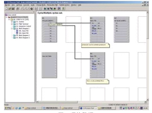 模擬量輸入模塊負責各傳感器的數據采集; CJ1W-TC103溫度模塊用于采集系統溫度信號,CJ1W-DA041模擬量輸出模塊用于向各比例控制放大器,變頻器發送控制信號。CJ1GCPU43P內置回路控制,在本系統中應用如下:主要使用兩個PID分別控制比例溢流閥及比例流量閥(見圖2)。在PID控制,