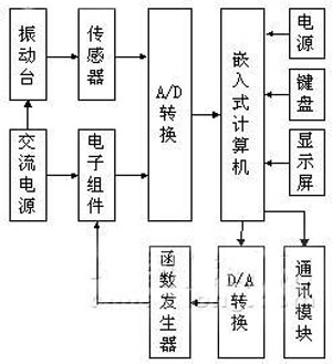 本檢測裝置可以按照維護要求對傳感器和電子組件實現離位測量。硬件系統主要由交流電源、直流電源、電動振動臺、PC104計算機系統、8038函數發生器、信號采集處理模塊、通訊模塊以及相應調理電路等組成。硬件系統設計原理如圖1。