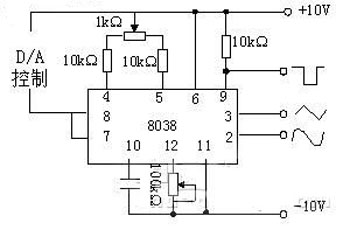 函數發生器電路是電路設計的核心部分,本裝置中采用8038構造頻率可調函數發生器。8038函數發生器是一種能產生方波、三角波、鋸齒波和正弦波的大規模集成電路。通過計算機可控制其產生頻率可調的正弦波。工作原理圖見圖2。測量用正弦波由三角波經正弦波變換器變換而得并由2號引腳引出,將此信號接入待測電子組件為其提供正弦模擬信號。通過調整1kΩ和10kΩ兩個電位器,可以使正弦波失真度減小到0.5%左右。6號和8號引腳間的電壓由D/A控制,通過程序調節兩引腳間的輸入電壓,控制函數發生器按維護要求提供20~2000Hz頻率可變的信號。