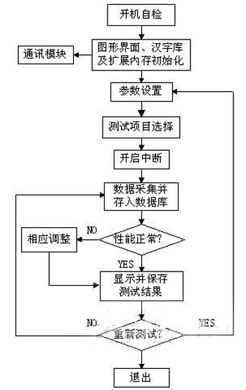 該系統軟件基于DOS系統,以Borland c++3.1作為開發平臺,采用圖形化界面,通過中斷控制進行實時采集、存儲及性能判斷,軟件的流程圖如圖3所示: