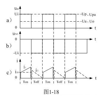 圖1-17中,在Ton期間,控制開關K接通,輸入電源Ui對變壓器初級線圈N1繞組加電,初級線圈N1繞組有電流i1流過,在N1兩端產生自感電動勢的同時,在變壓器次級線圈N2繞組的兩端也同時產生感應電動勢,并向負載提供輸出電壓。開關變壓器次級線圈輸出電壓大小由(1-63)、(1-69)、(1-76)、(1-77)等式給出,電壓輸出波形如圖1-18-a)。