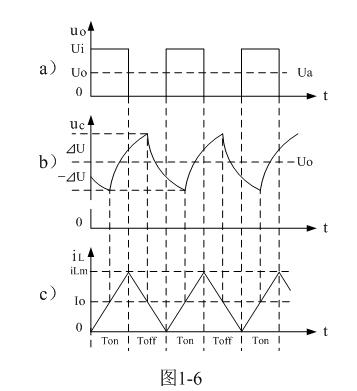圖1-6中,電容兩端的充放電曲線是有意把它的曲率放大了的,實(shí)際上它們的變化曲率并沒有那么大。因?yàn)閮?chǔ)能濾波電感L和儲(chǔ)能濾波電容構(gòu)成的時(shí)間常數(shù)相對(duì)于控制開關(guān)的接通或關(guān)斷時(shí)間來說非常大(正弦曲線的周期:
