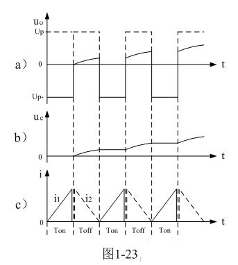 圖1-6是串聯(lián)式開關(guān)電源工作于臨界連續(xù)電流狀態(tài)時(shí),串聯(lián)式開關(guān)電源電路中各點(diǎn)電壓和電流的波形。圖1-6中,Ui為電源的輸入電壓,uo為控制開關(guān)K的輸出電壓,Uo為電源濾波輸出電壓,iL為流過儲(chǔ)能濾波電感電流,Io為流過負(fù)載的電流。圖1-6-a)是控制開關(guān)K輸出電壓的波形;圖1-6-b)是儲(chǔ)能濾波電容C的充、放電曲線圖;圖1-6-c)是流過儲(chǔ)能濾波電感電流iL的波形。當(dāng)串聯(lián)式開關(guān)電源工作于臨界連續(xù)電流狀態(tài)時(shí),控制開關(guān)K的占空比D等于0.5,流過負(fù)載的電流Io等于流過儲(chǔ)能濾波電感最大電流iLm的二分之一。
