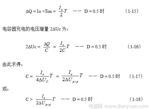 (1-17)和(1-18)式,就是計(jì)算串聯(lián)式開關(guān)電源儲(chǔ)能濾波電容的公式(D = 0.5時(shí))。式中:Io是流過負(fù)載的電流,T為控制開關(guān)K的工作周期,ΔUP-P為輸出電壓的波紋。電壓波紋ΔUP-P一般都取峰-峰值,所以電壓波紋正好等于電容器充電或放電時(shí)的電壓增量,即:ΔUP-P = 2ΔUc 。