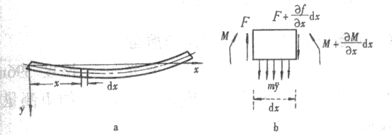 梁段的彎曲轉(zhuǎn)動效應(yīng)與剪切變形略去不計(jì),若引用牛頓力學(xué)來建立梁彎曲振動時(shí)的運(yùn)動方程,可由梁中截取一微元段,梁在對稱平面內(nèi)作鉛垂方向振動時(shí),微元主要作上下運(yùn)動。圖3a表示在梁在x一y平面內(nèi)振動。靜止時(shí)y(x,0)=0。在某種激勵下梁離開了平衡位置。從梁的任意截面x取出一小段dx,它的受力見圖3b。這一小段的質(zhì)量為m,上下振動的加速度為  y /  t 2。由微元段的平衡條件得到: