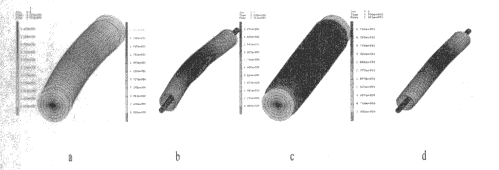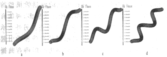圖7a~圖7d分別是CMF整體有限元模型的4階模態(tài)、套管彎曲、支承管和測量管彎曲、整體(三層管)扭轉(zhuǎn)、支承管彎曲等。為了便于查看,放大了變形,所以有時(shí)候會出現(xiàn)內(nèi)層管穿出來了,并不表示真的如此,實(shí)際中的變形是非常微小的。