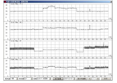 系統提供了實時曲線和歷史趨勢兩種曲線分析界面,通過調用相關回路實時曲線界面分析該回路當前的運行負荷狀況。如通過調用某配出回路的實時曲線可分析該回路的電氣設備所引起的信號波動情況。系統的歷史趨勢即系統對所有已存數據均可查看其歷史趨勢,方便工程人員對監測的配電網絡進行質量分析。