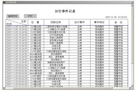 系統對所有用戶操作、開關變位、參量越限及其它用戶實際需求的事件均具有祥細的記錄功能,包括事件發生的時間位置,當前值班人員事件是否確認等信息,對開關變位、參量越限等信息還具有聲音報警功能,同時自動對運行設備發送控制指令或提示值班人員迅速排除故障。