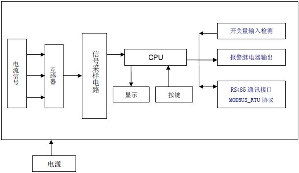 2 電路設計原理 ACM的硬件電路包括主CPU芯片、電源、信號采集電路、人機交互單元、RS485通訊接口、開關量輸入模塊及繼電器輸出接口(圖2)。