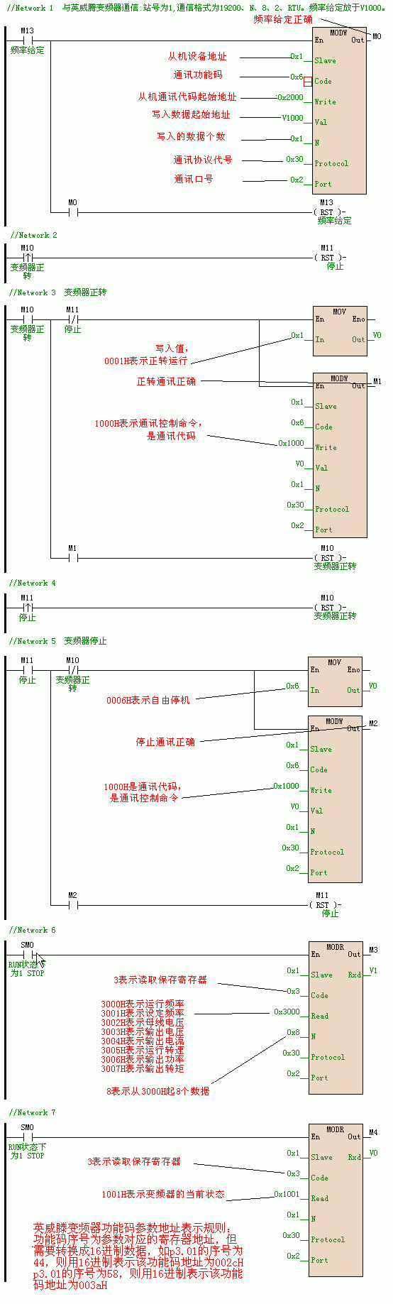 根據(jù)英威滕變頻器說明書,運行控制的參數(shù)地址為1000H,寫入值0001H表示正轉。